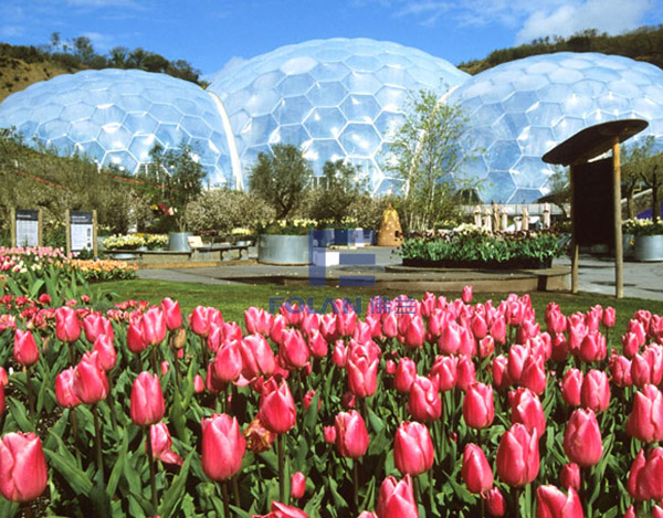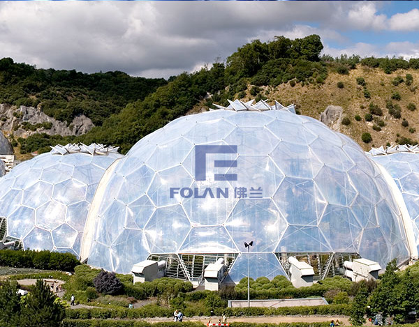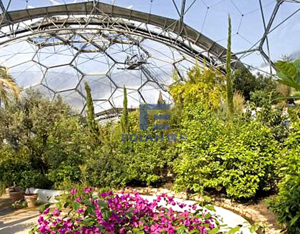 The world's largest botanical garden, to the inflated ETFE film structure. The whole building adopts single air pillow is fixed on the outside of the main steel structure, the hexagonal shape. Air pillow adopts three layer membrane structure, outer layer thickness of 250 microns, the inner film thickness is 200 microns, the middle thickness of 50 microns.