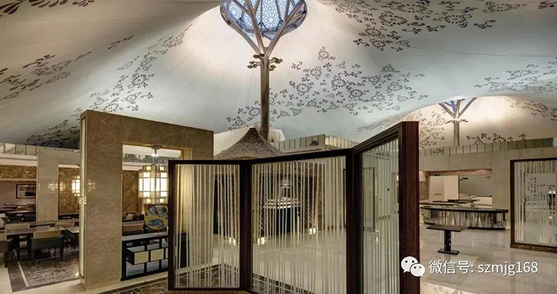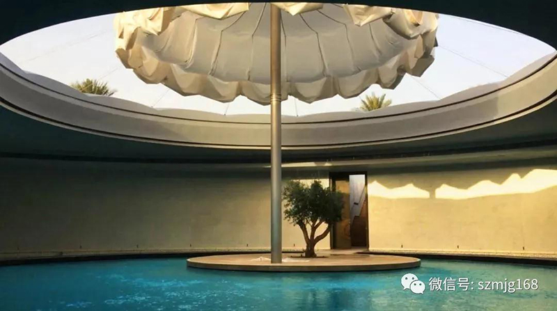 以及阿布扎比的一個私人會所,泳池上方有個大天窗,中間有10米高大傘,可根據(jù)天氣打開或合上。