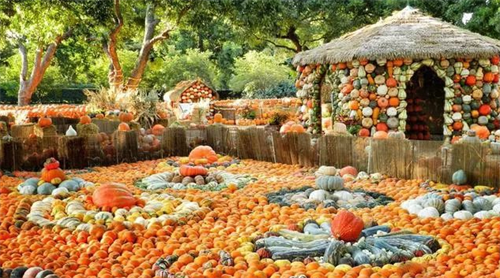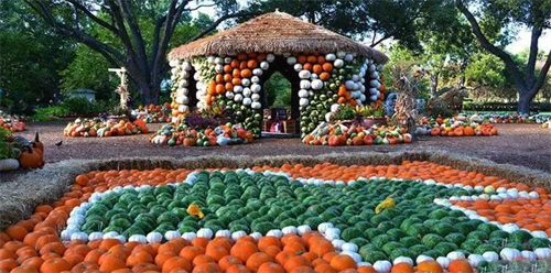 南瓜除了用于木雕,石雕,磚雕等,還能直接用于建造和裝飾房子。在美國達(dá)拉斯植物園,有一個(gè)叫羅里邁耶斯兒童冒險(xiǎn)樂園的特色兒童游園,全場都用瓜果蔬菜打造,共計(jì)花了5000個(gè)南瓜。它不光用南瓜來建造房子,還用南瓜裝飾花園、街道,門廊等。整個(gè)兒童樂園,布滿了日常餐桌上的瓜果蔬菜,可讓孩子親近自然、熱愛自然。