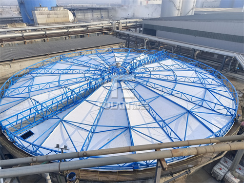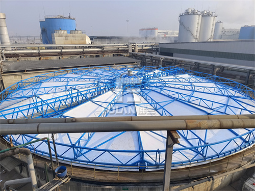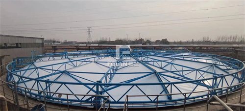 竣工后的污水池,呈扁平圓錐形,結構輕盈。白色的膜材,藍色的鋼構,大跨度空間膜結構污水池加蓋,既美觀大氣,又能幫助凈化廢氣保護環(huán)境。