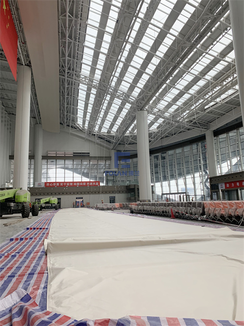 虎門高鐵站,建筑面積達(dá)26445平方米,佛蘭空間負(fù)責(zé)其高鐵站精裝修室內(nèi)吊頂工程,膜安裝面積約7000多平方米,施工方式采用多條長(zhǎng)型PTFE軟膜逐步安裝,其中最長(zhǎng)的一條約100米。