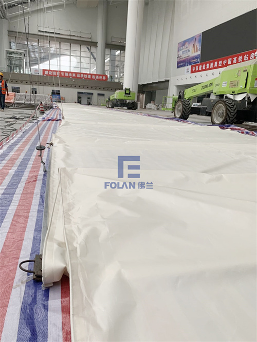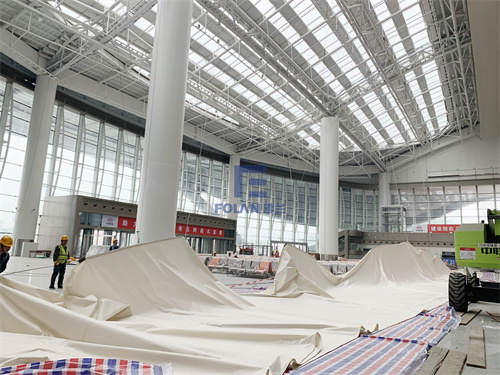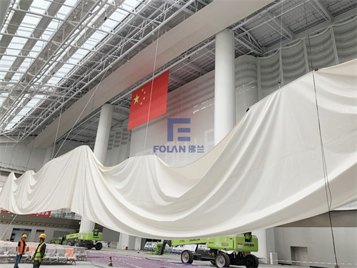 近期,佛蘭空間正在施工的虎門高鐵站精裝修室內(nèi)天花吊頂就運(yùn)用了PTFE軟膜。