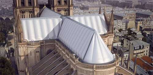 2019年,在巴黎圣母院屋頂線建筑競賽中,就有2個膜結(jié)構(gòu)建筑屋頂方案特別惹人眼球,膜結(jié)構(gòu)的運(yùn)用,使得莊嚴(yán)肅穆的教堂增添了些許現(xiàn)代時尚感。