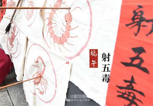 民間流傳,五月初五是毒月毒日,是蛇、壁虎、蝎子、蜈蚣、蟾蜍五毒出沒的日子。古時(shí)候,鄉(xiāng)里壯勇之士皆持弓箭赴本土保境廟宇加持祈福,祈求能以弓箭將本鄉(xiāng)本土境內(nèi)荼毒生靈的各類毒物驅(qū)逐殆盡。所謂“射五毒”,就是通過射五毒草靶來比賽射藝。