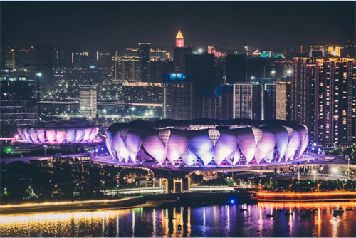 杭州奧體中心體育場屋頂由28片花瓣和27片小花瓣構(gòu)成,遠看好似一朵綻放在錢塘江畔的“蓮花”,十分動感飄逸。