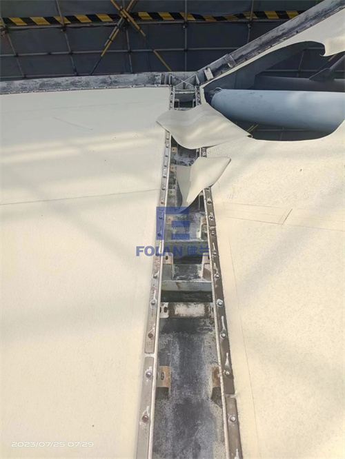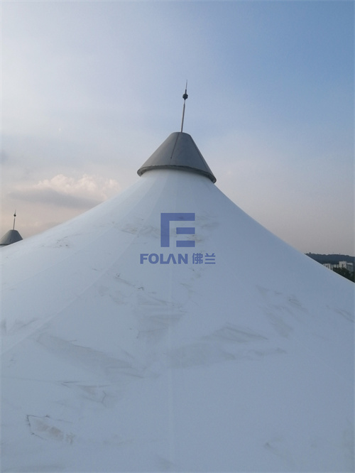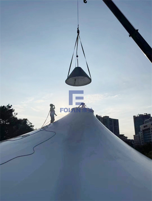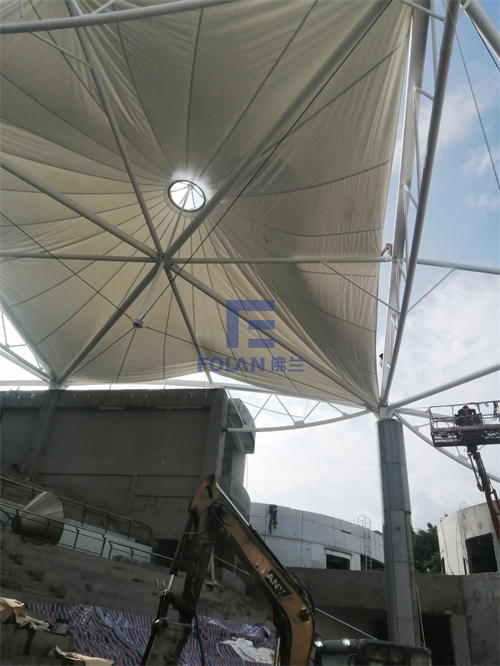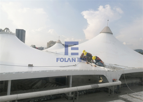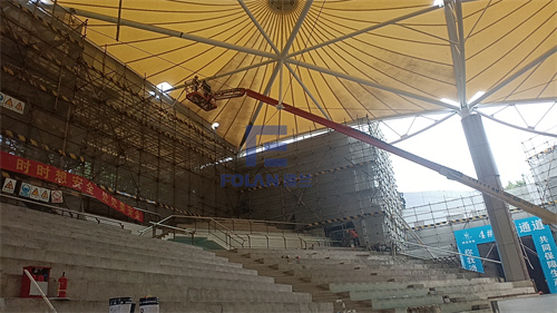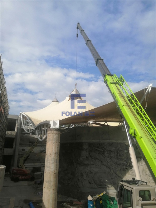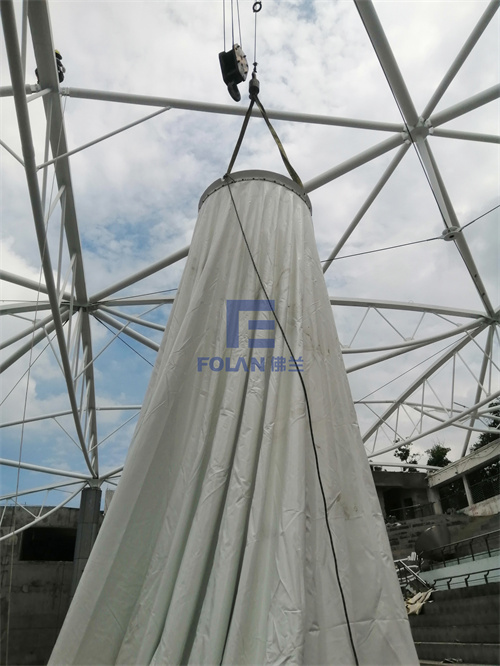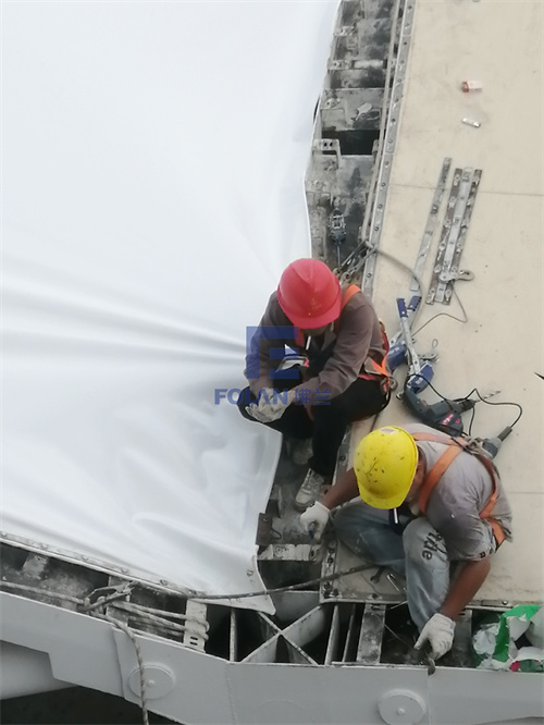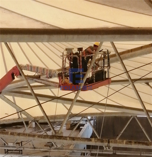當佛蘭空間項目施工人員將所有舊膜和零星固定桿件都已拆除,就要進行新膜的吊裝、安裝及固定等施工步驟。該項目新膜材選用的是進口法拉利1202S2高自潔PVDF膜,防霉防腐性能好,能長久保持其表面潔白美觀。