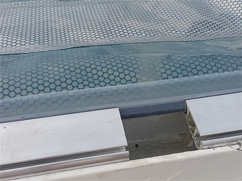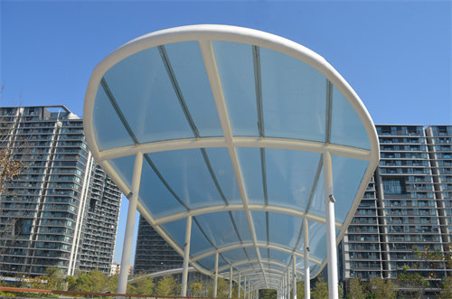 該天橋長92米,寬8.2米,面積約716平方米,是國內(nèi)首例采用單層ETFE新型隔熱膜材的天橋。膜材厚度250um,遮陽系數(shù)0.64,熱增益系數(shù)0.56,透光率55%一60%,防火級別為B1級。新型隔熱材料的選擇,為天橋上來來往往的行人提供了舒適的溫度。