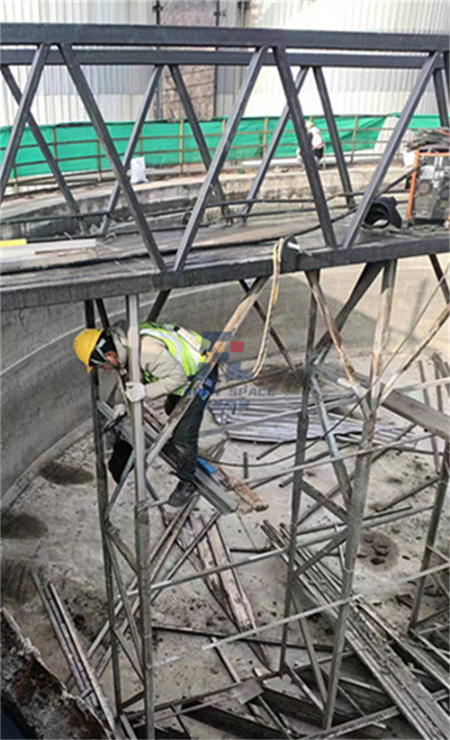 2023年末,佛蘭空間在九江接到了一個污水池改造升級項目,原有的半橋工作污水池,其頂部覆蓋著鋼結(jié)構(gòu)彩鋼板棚子,經(jīng)過歲月的洗禮,棚子、工作橋以及輪子周邊的鋼構(gòu)都已銹跡斑斑。這不僅影響了廢氣收集的效率,還為安全埋下了隱患。