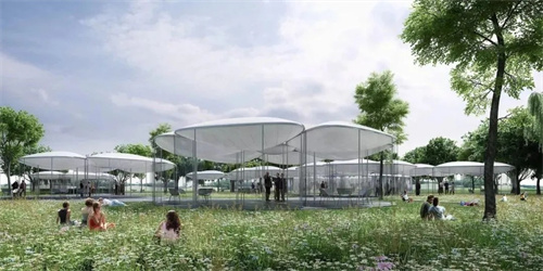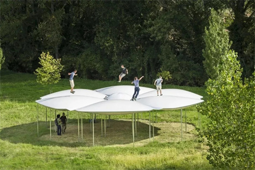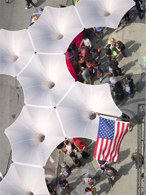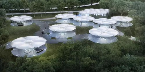 牽牛花造型雨傘膜結構建筑是一種低成本模塊化產(chǎn)品,可以在任何需要庇護的地方出現(xiàn)。這些獨立結構的花瓣無論是單獨還是概括起來,都為下面的活動和參與者提供了屋頂和空間組織。