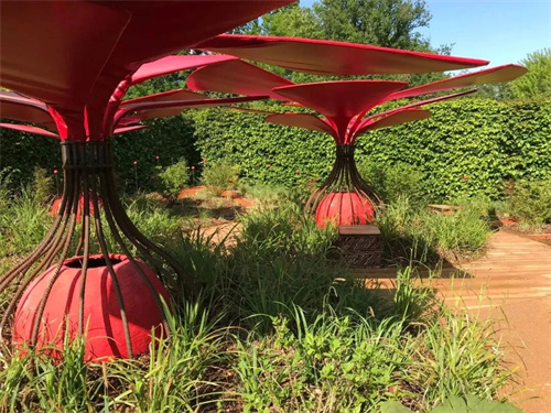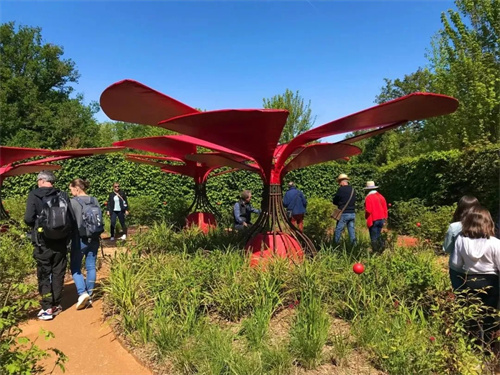 在去年舉辦的第30屆盧瓦爾河畔肖蒙國際花園節(jié)中,展示了很多新品花卉及創(chuàng)新展示方案,其中這個紅色花形景觀膜最具象征意義,它能啟發(fā)人們更多參與良性生態(tài)循環(huán),并警醒人們對水資源的價值認識。