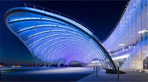 n 夜晚結(jié)合LED燈光系統(tǒng),將雨棚轉(zhuǎn)變?yōu)楠毺氐乃囆g(shù)裝置