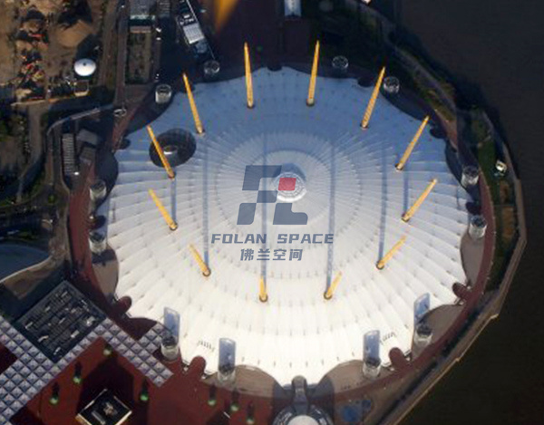 由12根100米高的鋼構(gòu)式桅桿支撐72塊PTFE膜材料構(gòu)成的結(jié)構(gòu),直徑為320米,相當(dāng)于20塊足球場地大小,是目前世界上單體規(guī)模大的膜結(jié)構(gòu)建筑。