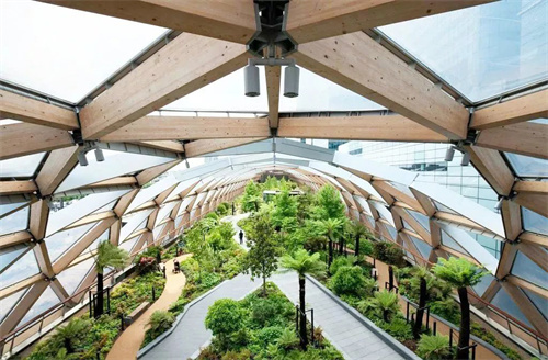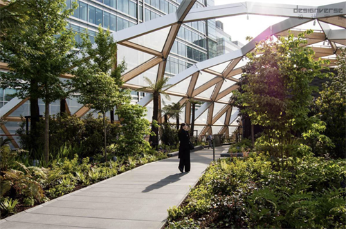 2008年,Gillespies受金絲雀碼頭集團(tuán)的委托,創(chuàng)建了一個獨特的、部分封閉的高架公共花園,花園部分被一個獨特的木柵格ETFE屋頂包圍,像一個保護(hù)殼一樣包裹著建筑。