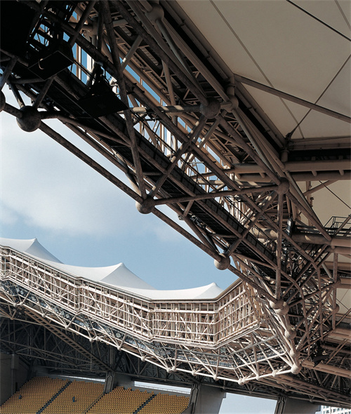 1997年在上海八萬(wàn)人體育場(chǎng)舉行第七屆全國(guó)運(yùn)動(dòng)會(huì),觀眾席上方采用馬鞍形大懸挑鋼管空間屋蓋結(jié)構(gòu),覆以乳白色PTFE薄膜材料,面積為3.6萬(wàn)平方米,這是中國(guó)第一次將膜結(jié)構(gòu)用在大面積的永久性建筑上。