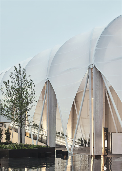 在立體花園的外側(cè)懸掛著半透明的透光率40%的PTFE網(wǎng)格膜材,在炎熱季節(jié)起到遮陽(yáng)和通風(fēng)作用的同時(shí),也讓建筑看起來(lái)飄逸,輕盈,好像一層透薄柔軟的皮膚覆蓋在建筑骨架之上。