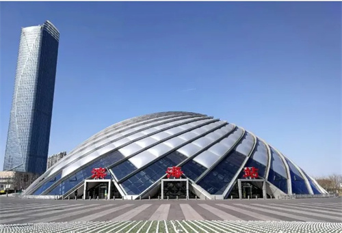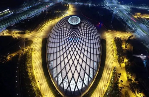 國際最大單殼體膜結(jié)構(gòu),其雙螺旋穹頂由783個大小不同的ETFE氣枕組成,長143米,寬80米,形成了獨特的“貝殼”造型。該設(shè)計不僅美觀,還解決了大跨度空間的保溫、透光和隔熱難題,同時配置了消防熔斷系統(tǒng),確保了消防安全。