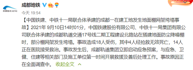事故發(fā)生后,成都軌道集團立即啟動應急預案,與應急、衛(wèi)健、住建等相關(guān)部門及施工單位第一時間開展救援及善后處理工作。事故原因正在全面調(diào)查中。