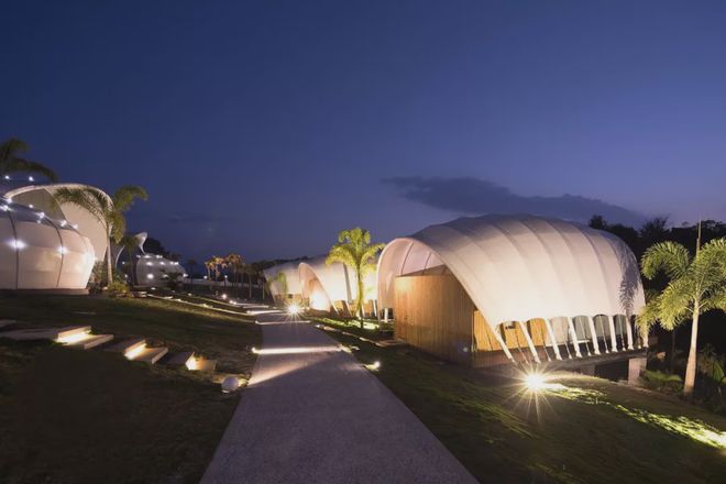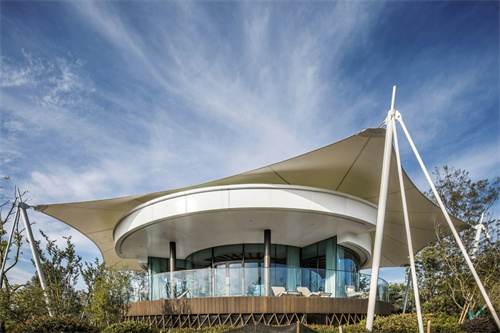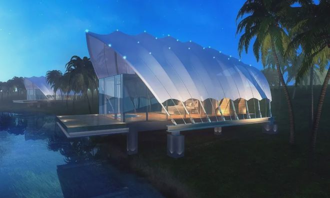 可見澤棲帳篷酒店,所有建筑都采用了張拉膜結構,完美地體現(xiàn)了建筑的獨特意象。