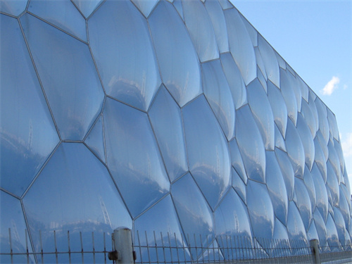 水立方的幕墻由3800多個ETFE(四氟乙烯)氣枕組成,共有11種不同的形狀,氣枕上布滿了肉眼看不見的鍍點,其原材料是一種耐高溫的油墨。