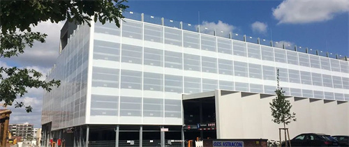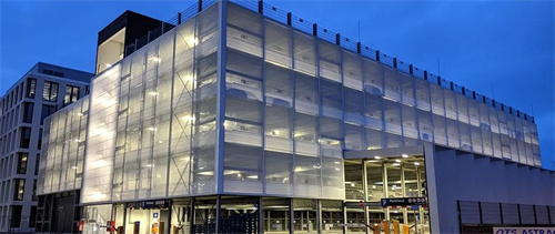 在德國不來梅的一個有蓋停車場立面,擁有近1,200平方米的ETFE。為避免被汽車大燈分散注意力,ETFE薄膜在下部區(qū)域采用白色涂料,在較高區(qū)域的薄膜采用白色印點設(shè)計。