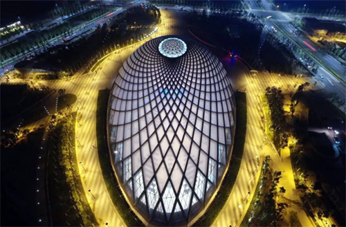 其復(fù)雜優(yōu)美的網(wǎng)格形式在國(guó)內(nèi)大跨度鋼結(jié)構(gòu)領(lǐng)域?qū)儆谑讋?chuàng),同時(shí),將支座設(shè)計(jì)成雙球鉸鋼支座,也是國(guó)內(nèi)網(wǎng)殼結(jié)構(gòu)的首例。