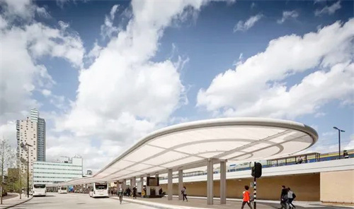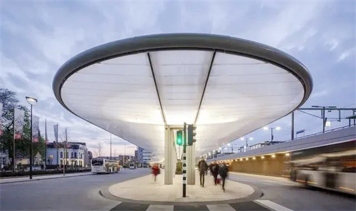 這個(gè)像云朵一樣的公交候車(chē)亭使用的是“氣枕式單室膜氣枕”。“浮動(dòng)”遮陽(yáng)結(jié)構(gòu)占地超過(guò)1000平方米,由鋼框架支撐。由合成材料ETFE制成的充氣膜氣枕形成了不規(guī)則的鋼索網(wǎng)格。