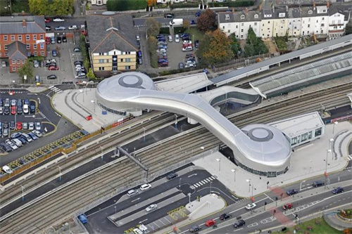 兩個(gè)位于鐵路兩側(cè)的圓頂建筑通過(guò)橫跨鐵路的天橋連接起來(lái),材料是ETFE和鋁飄帶。螺旋狀的通道將乘客引入其中。設(shè)計(jì)通過(guò)忽略場(chǎng)地的方式對(duì)周?chē)h(huán)境和建筑做出回應(yīng)。其圓潤(rùn)的形體模糊了屋頂和墻面、橋梁與建筑的范圍,乘客將在這里感受到一種獨(dú)特的異構(gòu)空間。