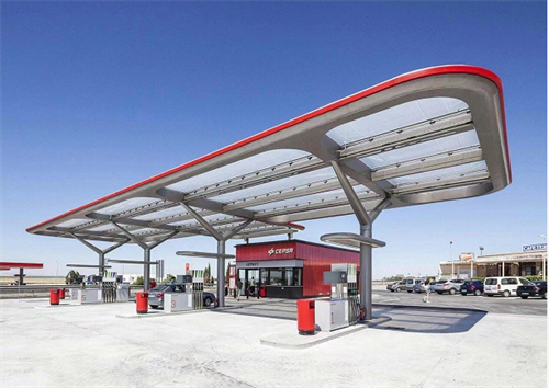 CEPSA公司是西班牙第二大石油公司,位于西班牙阿維拉的加油站設(shè)計(jì)基于品牌高技術(shù)和優(yōu)質(zhì)服務(wù)的特點(diǎn),以樹(shù)木為意向,設(shè)計(jì)加油站雨棚、泵站、照明與標(biāo)志。雨棚采用模塊化組織、可自潔的高科技ETFE材料,不僅重量輕并且可回收利用,夜晚柔光的紅色增添一絲暖意。