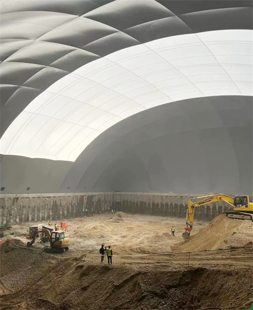“基坑氣膜”建筑是采用內(nèi)外氣壓差支撐的新型建筑結(jié)構(gòu),再利用斜向網(wǎng)狀結(jié)構(gòu)加以固定,將膜材固定于地面基礎(chǔ)結(jié)構(gòu)周邊,利用供風(fēng)系統(tǒng)讓室內(nèi)氣壓上升到一定壓力后,使屋頂內(nèi)外產(chǎn)生壓力差以抵抗外力,由于利用氣壓來支撐,無需任何梁、柱,所以可得到更大的完全凈空的建筑空間。