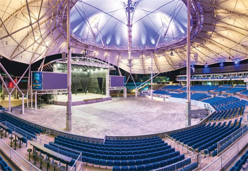 哈特福特市醫(yī)療保健機(jī)構(gòu)圓形劇場采用發(fā)光聚四氟乙烯涂層玻璃織物。在穹頂桅桿接觸屋頂織物的部位,FTL使用四氟乙烯箔皮以獲取更多的光線射入。同時(shí),在穹頂和下部圍護(hù)結(jié)構(gòu)之間采用黑色網(wǎng)狀織物提供被動(dòng)散熱能力。