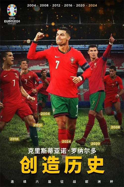 本場(chǎng)C羅首發(fā),他成為唯一一位連續(xù)六屆征戰(zhàn)歐洲杯的球員,創(chuàng)造歷史。