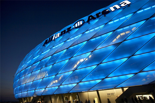 安聯(lián)球場的設(shè)計(jì)非常現(xiàn)代化,外立面的LED燈可以根據(jù)比賽情況變換顏色,極具視覺沖擊力。當(dāng)拜仁慕尼黑隊(duì)主場比賽時,體育場會變成紅色;當(dāng)慕尼黑1860隊(duì)主場比賽時,體育場會變成藍(lán)色;世界杯比賽中,德國國家隊(duì)在這里比賽時,體育場則會變成白色。