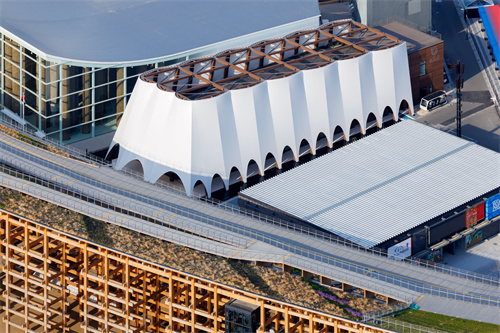 卡塔爾館,由隈研吾建筑都市設(shè)計(jì)事務(wù)所與卡塔爾博物館合作設(shè)計(jì),造型宛如一艘傳統(tǒng)的單桅三角帆船(dhow),這種帆船曾是阿拉伯灣貿(mào)易和采珠業(yè)的重要工具。展館的白色弧形頂篷懸掛在精巧連接的木框架上,既像迎風(fēng)招展的船帆,又像日本和卡塔爾木工工藝中那種富有張力的寧靜。