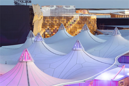 盧森堡館的外在建筑采用現(xiàn)代張拉膜結(jié)構(gòu),這種結(jié)構(gòu)利用高強(qiáng)度的柔性薄膜材料,通過拉索或剛性支撐結(jié)構(gòu)施加張力,形成穩(wěn)定的曲面。張拉膜結(jié)構(gòu)的優(yōu)勢在盧森堡館設(shè)計中得以充分展現(xiàn)。它不僅實現(xiàn)了無柱大空間的流暢布局,更創(chuàng)造出富有藝術(shù)感的曲面造型,使建筑本身成為一件巨大的藝術(shù)品。